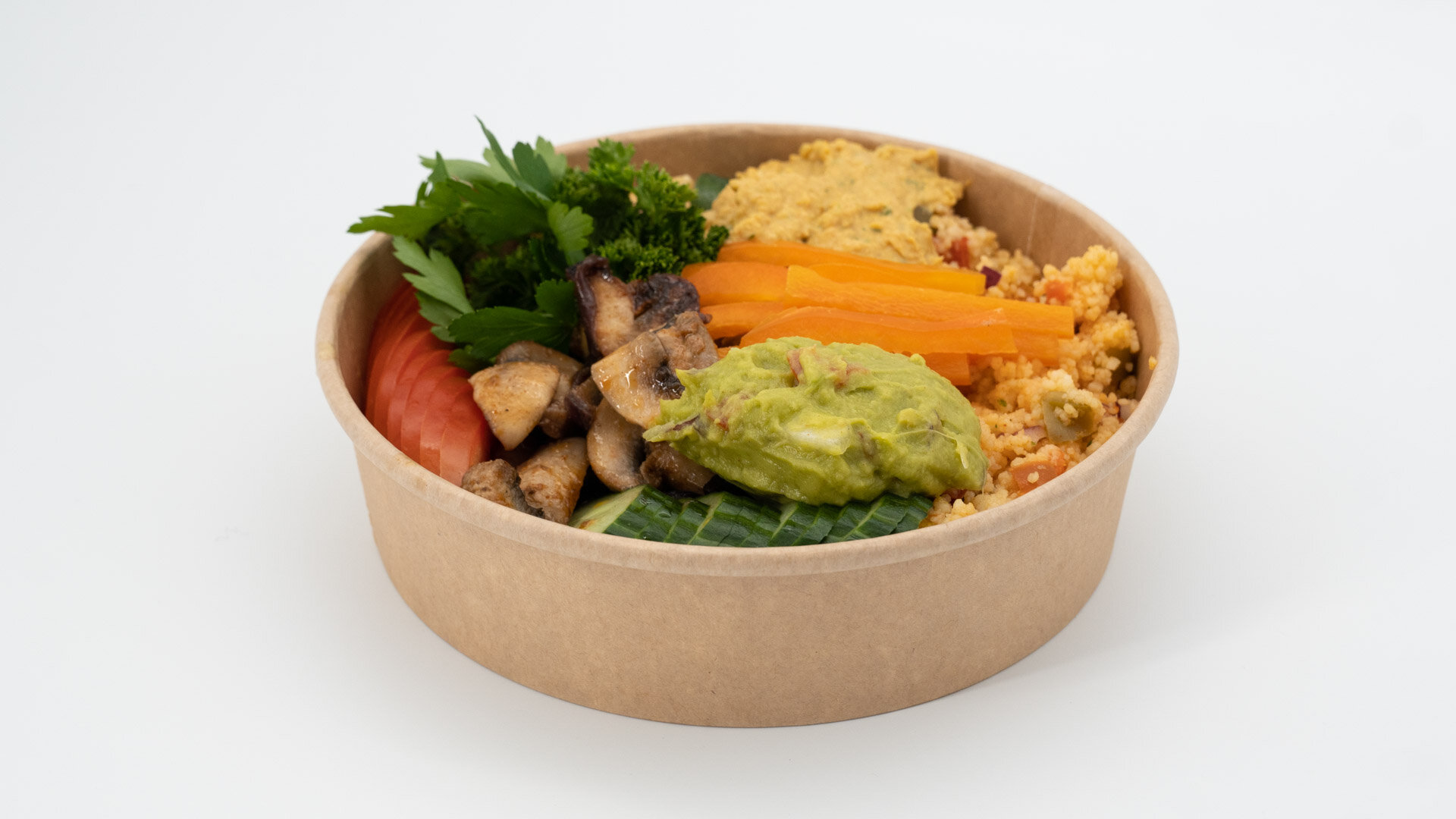 Served with couscous salad, chickpea salad, mushrooms, bell peppers, tomatoes, cucumbers, guacamole, and hummus.